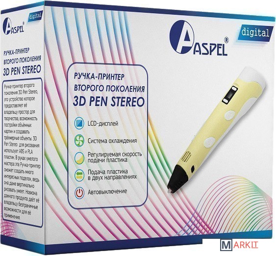 Компактное современное устройство, позволяющее создавать трёхмерные объекты с помощью специального пластика. Ручка оснащена LCD дисплеем, на котором выставляется температура плавления и регулируется скорость подачи пластика. Имеется встроенная система охлаждения. Нагревательное кольцо и сопло интегрированы в корпус ручки, что делает её использование абсолютно безопасным.