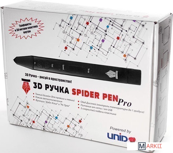 | Комплектация | - 3D ручка Spider Pen PRO c OLED дисплеем;- 10 метров пластика в комплекте (5 метров PLA пластика + 5 метров PRO пластика);- Адаптер питания USB;- Кабель USB;- Инструкция. |