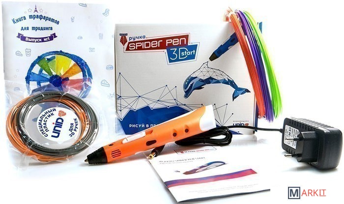 Комплектация - 3D ручка Spider Pen START;- Блок питания;- Демо-комлект пластика 10 метров;- Промо-комплект пластика 30 метров;- Инструкция на русском языке;- Книга трафаретов.