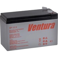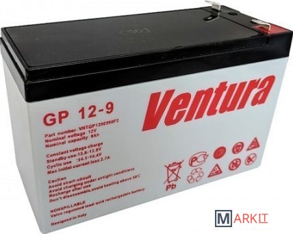 Аккумулятор Ventura GP12-9 обладает низким внутренним сопротивлением, он может использоваться в буферном и циклическом режимах. Благодаря своим характеристикам (9 Ач, 12 В) и продолжительному сроку службы (6 лет) он применяется в ИБП, нефтегазовой отрасли, охранно-охранных системах и телекоммуникациях. Корпус представляет из себя герметичный моноблок, выполненный из ABS-пластика, на крышке которого располагается односторонний клапан избыточного давления, это позволяет использовать Ventura GP 12-9 в горизонтальном и вертикальном положении (установка на крышку не допускается). Сепараторы из стекловолокна (AGM) удерживают жидкий электролит неподвижно. Дата производства аккумулятора Ventura GP12-9 указана на крышке в виде символьного кода.