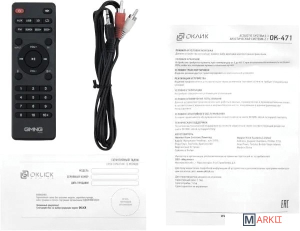 - пульт ДУ- аудиокабель 3.5 мм - 2RCA- документация |