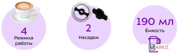 | Режимы приготовления | вспенивание холодного молока, вспенивание горячего молока, подогрев молока (смешивание с подогревом и без) |