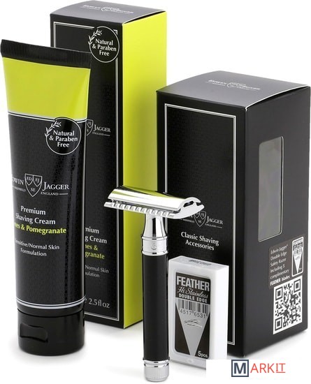 Подарочный набор английского бренда Edwin Jagger, состоящий из т-образного бритвенного станка DE86 с ручкой черная смола и крема для бритья с ароматом Лайм и Гранат. В набор также входит одно лезвие Feather. Набор поставляется в фирменной подарочной упаковке.