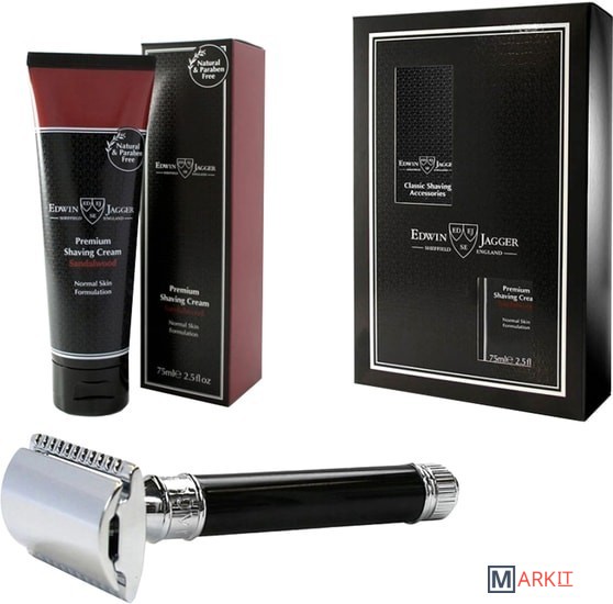 Подарочный набор английского бренда Edwin Jagger, состоящий из т-образного станка DE86 с ручкой из черного акрила и крема для бритья сандал. В набор также входит упаковка из 5 лезвий Feather. Набор сложен в фирменную подарочную упаковку.