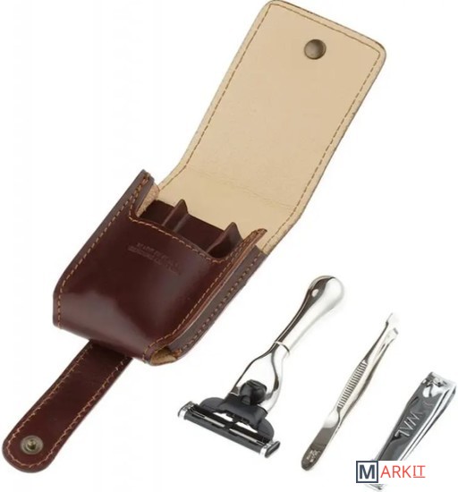 Станок для бритья MACH3: никелированная латунь (1 кассета в комплекте).Материал чехла: натуральная кожа, 60 x 85 x 10 мм.