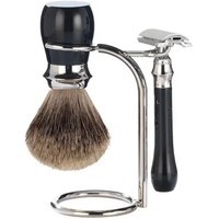 Набор из коллекции GAUDI с помазком Tasso Tec / Best Badger из натурального барсучьего волоса, классический станок для двух лезвий. Материал — чёрная смола.