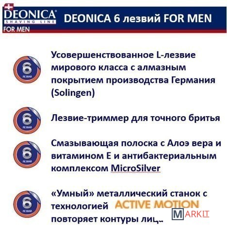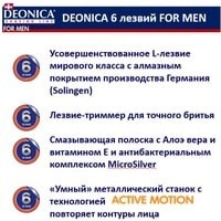 Улучшенная технология 6 лезвийной бреющей поверхности мужской бритвы Deonica максимально снижает давление на кожу и обеспечивает идеальный комфорт при бритье. 6 тонких L лезвий мирового класса произведены в Германии. Алмазное покрытие лезвий бритвы Деоника обеспечивает идеально гладкое бритье и увеличивает срок их использования. Смазывающая полоска с Алоэ Вера, витамином Е и антибактериальным комплексом MicroSilver обеспечивает безупречное скольжение. Технология ActiveMotion позволяет бритвенной системе Deonica следовать точно по контурам вашего лица, обеспечивая идеальное бритье. Для подравнивания усов и бороды есть специальное лезвие триммер. Удобная металлическая ручка станка для бритья обеспечивает контроль над каждым движением, а широкие резиновые вставки не позволят выскользнуть ручке в процессе бритья. Бритва мужская Deonica совместима с любыми сменными кассетами Deonica for Men на 3, 5 или 6 лезвий. Гладкое и комфортное бритье без раздражений даже на самой чувствительной коже!