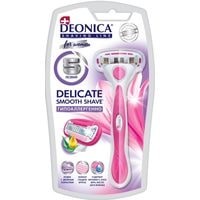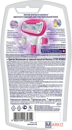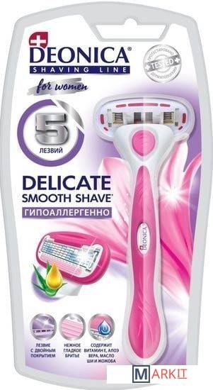 Технология 5-лезвийной бреющей поверхности женской безопасной бритвы Deonica снижает давление на кожу, обеспечивая максимальный комфорт во время бритья даже для самой чувствительной кожи. 5 тонких лезвий мирового класса произведены в США, они имеют двойное керамическое покрытие, что гарантирует более точное и чистое бритьеПластиковая ручка с резиновыми вставками обеспечивает удобный обхват – она не будет выскальзывать у вас из рук в процессе бритьяСмазывающая полоска с Алоэ Вера, витамином Е, маслом Ши и Жожоба нежно ухаживает за кожей и обеспечивает безупречное скольжениеГладкое и комфортное бритье без раздражений даже на самой чувствительной коже