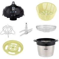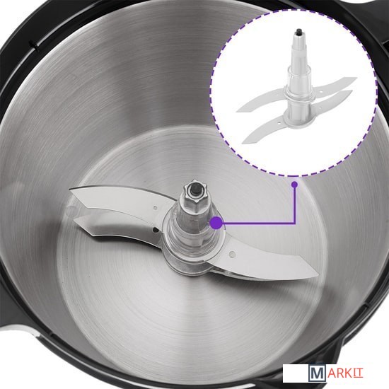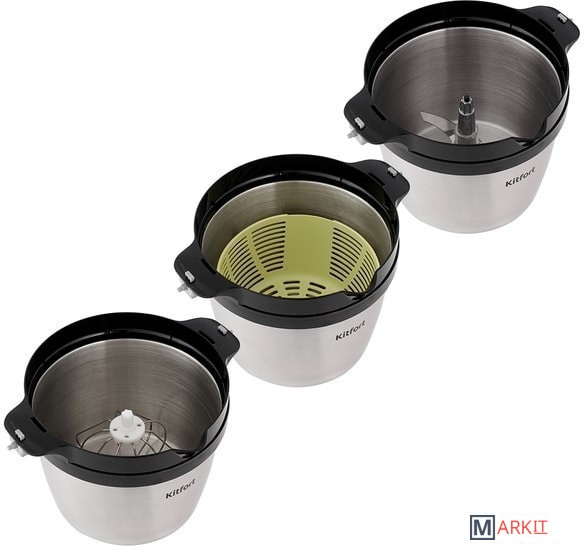 Прибор укомплектован ножом, венчиком для взбивания, корзиной для смешивания, а также крышкой чаши измельчителя для безопасной работы и крышкой съемной корзины