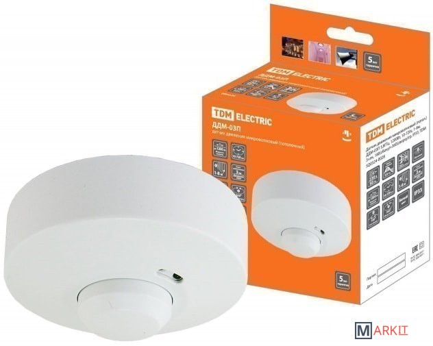 Для автоматического включения и отключения нагрузки в заданном интервале времени при появлении движущихся объектов в зоне обнаружения датчика и в зависимости от уровня освещенности в однофазных электрических сетях переменного тока напряжением 230В и частотой 50Гц.Микроволновые датчики движения работают по принципу локации СВЧ излучением «на отражение». Датчики испускают высокочастотные электромагнитные волны с частотой 5,8 ГГц и получают эхо, отраженное от объектов.Корпус датчика выполнен из не поддерживающего горение пластика.Датчик способен обнаруживать объекты через препятствия: тонкие стены, двери, стекла и др. (в связи с этим возможно спрятать датчик под стеклом светильника, подвесным или натяжным потолком, установить внутри дома перед дверью для обнаружения объектов на улице);Чувствительность датчика не зависит от температуры окружающей среды (в отличии от инфракрасных, данный датчик сохраняет максимальную дальность обнаружения при температуре окружающей среды свыше 250С);Датчик способен реагировать на самые незначительные движения объекта (для обнаружения объектов датчиками инфракрасного типа требовалось пересечение им минимум 2-х лучей);Микроволновый датчик движения обладает более компактными размерами по отношению к инфракрасным датчикам.Минимальная коммутируемая нагрузка от 1 Вт позволяет использовать датчик с маломощными светодиодными лампами и светильникамиУгол обнаружения сбоку составляет 180°.Угол обнаружения сверху составляет 360°.Дальность 8 м.
