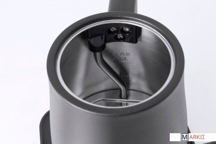 Матовый корпус;Изогнутый носик;Базовая станция с местом для кабеля;Теплоизолированая прохладная ручка;Кнопка включения с подсветкой;Автоматическое отключение;Нескользящие прорезиненные ножки;Защита от перегрева;Защита от выкипания.
