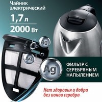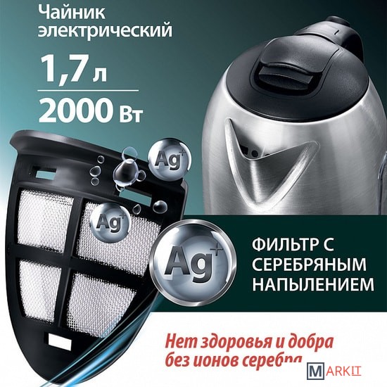Съемный фильтр с серебряным напылением;Световой индикатор работы;База питания с отсеком для хранения шнура;Автоматическое отключение при закипании;Блокировка включения без воды.