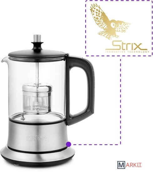 Чайник оснащён контроллером Strix. Он устраняет риски короткого замыкания и возгорания прибора. Обеспечивает защиту при закипании, при включении чайника без воды и при снятии с базы во время работы.