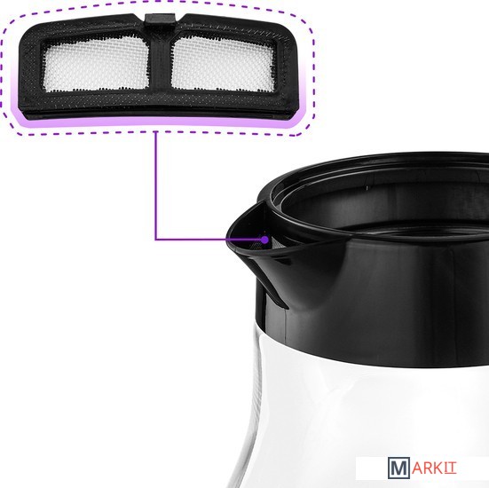 Фильтр для заваркиВ комплекте к чайнику идёт съёмный чаезаварочный механизм. Заваривайте чай прямо в чайнике: нагрейте воду, засыпьте заварку в фильтр и установите его в чайник.Защита от накипиВ носике чайника расположен нейлоновый фильтр от накипи, который задерживает частички накипи и предотвращает их попадание в чашку.