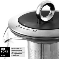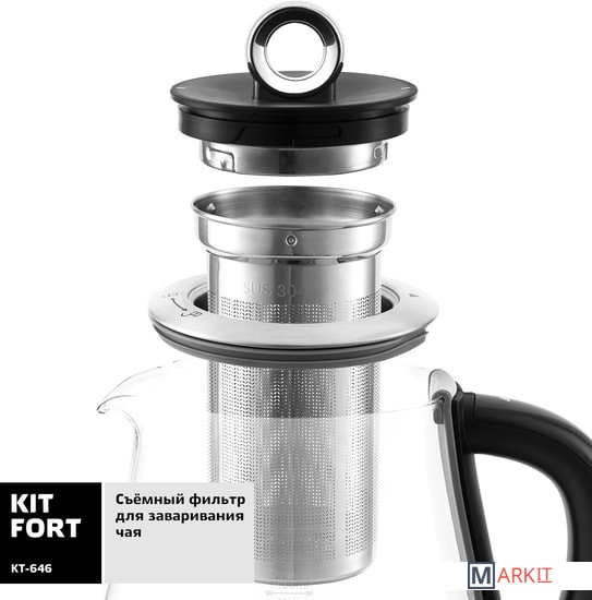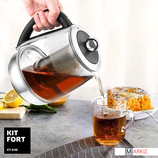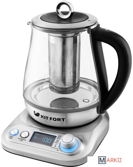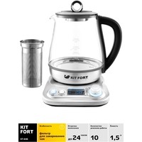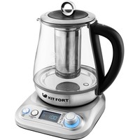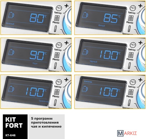 Электрический чайник с терморегулятором и электронным управлением Kitfort КТ-646 не только кипятит воду. Он имеет 10 режимов работы, в том числе 5 программ приготовления чая, для каждого сорта чая предустановлена своя температура нагревания воды: зеленый (80 °С), черный (100 °С), белый (85 °С), улун (90 °С) или травяной (100 °С). Есть программа приготовления йогурта (42 °С) и программа подогрева детского питания или молока (55 °С), а также пользовательский режим, в котором можно выставить свои температуру (40-100 °С) и время приготовления (от 1 минуты до 1 часа). Предусмотрен режим отсрочки включения (отложенный старт): от 3 до 24 часов.