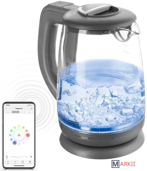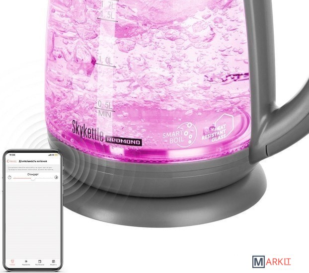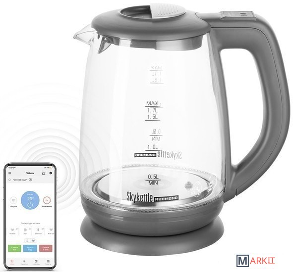 SkyKettle RK-G212S – современный электрический чайник-светильник с технологией дистанционного управления через мобильное приложение Ready for Sky.Прибор не только кипятит воду, но и нагревает ее без кипячения. Выберите на панели прибора нужное температурное значение 40, 50, 70 или 85°С и вам не придется ждать, пока остынет кипяток для заваривания смеси для ребенка или разведения спортивной добавки перед тренировкой.Благодаря высокой мощности 2200 Вт, максимально возможный объем воды 1, 7 л воды чайник нагревает за 2-3 минуты.Дистанционное управлениеУправляйте умным чайником из приложения Ready for Sky и вам будут доступны максимальные возможности SkyKettle. Со смартфона вы сможете:-установить температуру нагрева воды с точностью до 1°С: черный чай рекомендуется заваривать не кипятком, а водой с температурой 95°С, зеленый – с температурой 80°С, а чтобы приготовить детскую смесь и дополнительно ее не остужать, хватит 40-50°С;-настроить удобное расписание кипячения и нагрева воды – каждый будний день с утра, к вашему пробуждению, вода в SkyKettle уже будет горячей;-подобрать во встроенной кулинарной книге напиток и запустить приготовление воды для него прямо из рецепта;-выбрать оттенок подсветки при работе или активировать режим ночника – в темноте чайник будет светиться выбранным цветом;-использовать чайник в режиме «Диско-чай» – прибор будет менять цвет в так музыке или вашему голосу;поиграть с ребенком в игры: «Угадай цвет», «Тренируй память» или «Тренируй внимание»;-использовать функцию «Свежая вода» и получать уведомления о необходимости замены воды.Дома закончился чай? Закажите его через SkyMarket – доступный из приложения сервис встроенных покупок. Ароматный и изысканный чай доставят прямо из сети магазинов «Унция».Поддерживает температуру водыУстроили чаепитие и уже налили по кружке чая гостям? Наверняка кто-то захочет еще немного чая, или у кого-то чай остынет. SkyKettle нагреет воду и в течение 12 часов будет поддерживать ее температуру. Как только вода начнет остывать, чайник автоматически включится и вновь нагреет ее до нужной температуры. При этом повторно кипятить ее не будет.АвтоотключениеМодель RK-G212S оснащена надежной контактной группой марки Strix®. Встроенный контроллер обладает высокой чувствительностью и моментально реагирует на закипание, недостаточное количество воды в колбе, а также на отсоединение прибора от подставки во время работы – во всех трех случаях чайник автоматически отключается. Автоотключение позволяет избежать разбрызгивания кипятка, перегрева прибора и его выхода из строя.Гнездо соединения корпуса чайника и подставки расположено по центру – благодаря этому прибор легко вращать на 360°, так, чтобы при кипении пар не попадал на обои, декоративные покрытия, близко стоящие электронные приборы, которые могут пострадать от повышенной влажности и температуры.