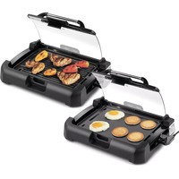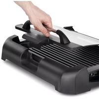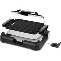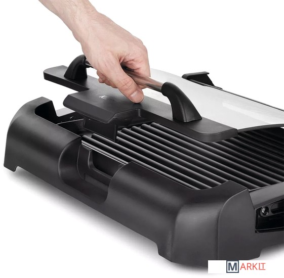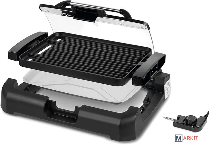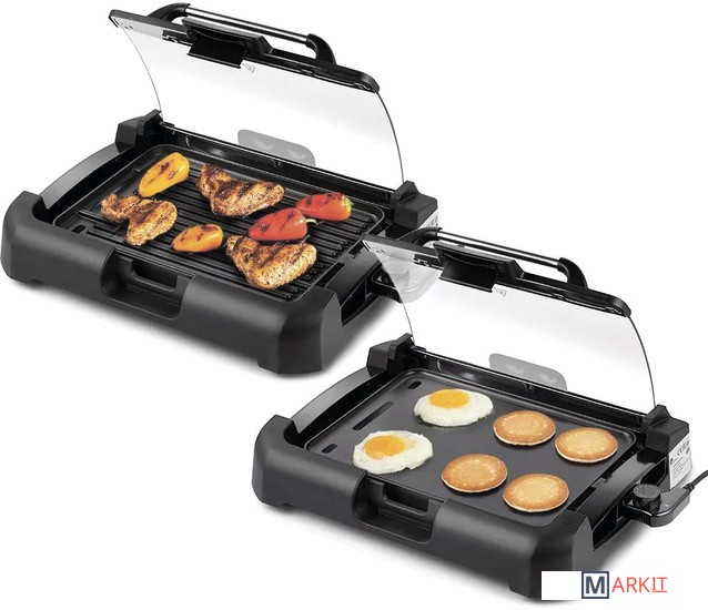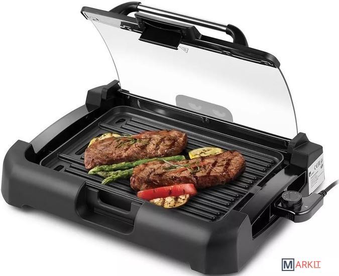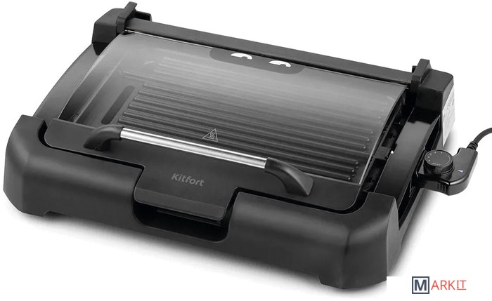 Может всё!Электрический гриль КТ-1673 предназначен для приготовления мяса, рыбы, овощей, сосисок, бутербродов, панини, сэндвичей, гренок, тостов и многих других блюд. Высокая температура панели способствует быстрому приготовлению продуктов.Одна панель – два варианта использования!Антипригарная панель является двусторонней, с одной стороны гладкая поверхность, с другой – ребристая. Вы можете готовить как блюда с характерным «полосатым» рисунком, например, овощи-гриль, так и панкейки, яичницу и многое другое.Готовьте вкусно, быстро, безопасно!Благодаря конструкции панели со встроенным нагревателем нагрев и передача температуры на поверхность происходит эффективнее, и время прогрева и приготовления сокращается. Противоскользящие ножки не дают прибору скользить по столу во время готовки.5 режимов нагреваРегулятором температуры устанавливается уровень нагрева панели от 140 до 240° C. Регулятор является ручкой термостата. Термостат обеспечивает возможность плавно регулировать температуру и поддерживать ее в процессе приготовления.Удобство во всёмНакрывается гриль крышкой из закалённого стекла, через неё можно наблюдать за процессом приготовления. Удобная ручка не нагревается. Крышка фиксируется в верхнем положении, поэтому вам не придётся её снимать и искать дополнительное место на столе.Разборная конструкцияРазборная конструкция в разы облегчает очистку электрогриля. Панель легко очищается бумажными полотенцами или салфетками. В основание установлен поддон для жира и сока, что удобно при готовке и при его мытье. Крышка гриля тоже съёмная.
