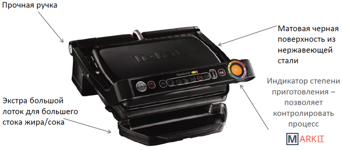 - 6 автоматических программ приготовления: бургер, птица, сэндвичи, сосиски, стейк и рыба- режим приготовления замороженных продуктов- индикатор уровня приготовления- датчик приготовления пищи автоматически определяет количество элементов приготовления а также их толщину, чтобы автоматически регулировать температуру- термопластичная ручка- в комплекте противень для выпечки и запекания
