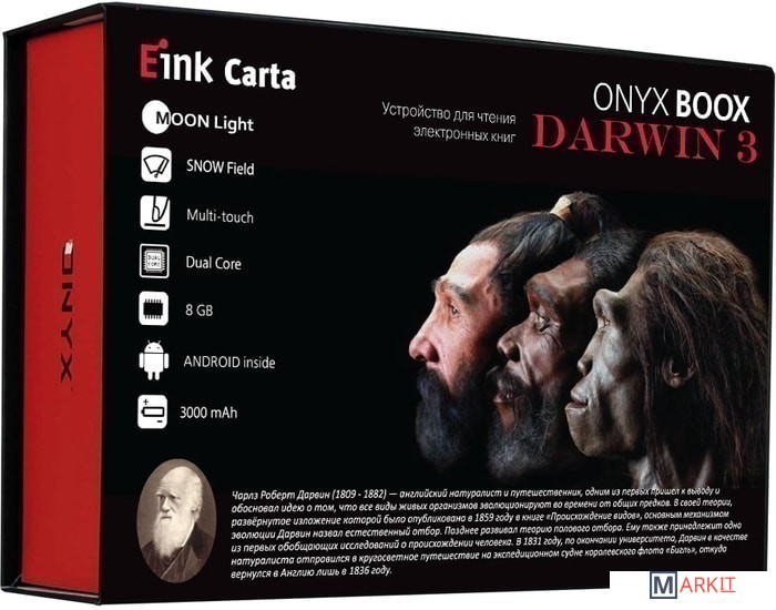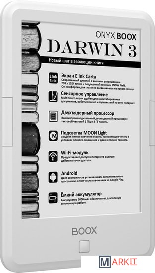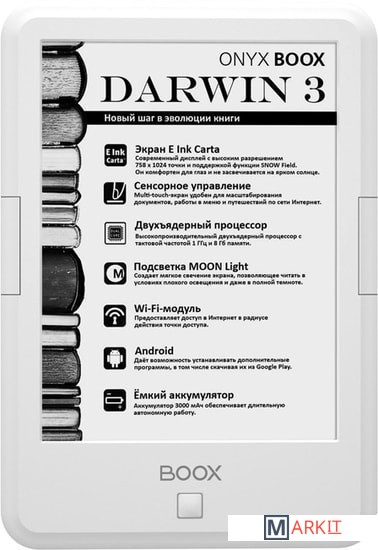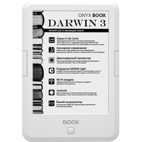 ONYX BOOX Darwin 3 — это устройство для чтения электронных книг с экраном типа «электронная бумага» E Ink Carta с функцией SNOW Field и встроенной системой подсветки MOON Light. Ридер имеет технические характеристики: высокопроизводительный 2-ядерный процессор, 512 МБ оперативной и 8 ГБ встроенной памяти.