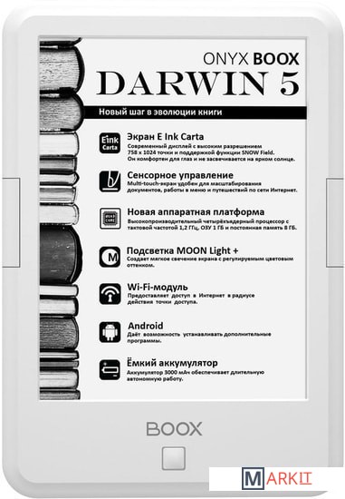ONYX BOOX Darwin 5 — это устройство для чтения электронных книг с современным экраном типа «электронная бумага» E Ink Carta с функцией SNOW Field и встроенной системой подсветки MOON Light+ с регулировкой цветовой температуры.