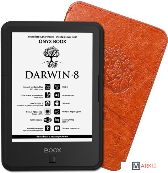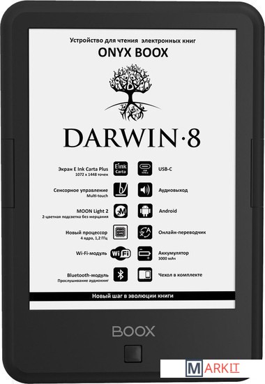 ONYX BOOX Darwin 8 — это устройство для чтения электронных книг с 6-дюймовым экраном E Ink Carta Plus, имеющим самые высокие разрешение и контрастность для такого размера. Модель имеет сенсорное управление и подсветку c регулировкой цветового оттенка и отсутствием мерцания. Функция SNOW Field позволяет существенно снизить количество артефактов при частичной перерисовке. Модуль Wi-Fi дает возможность использовать различные онлайн-сервисы и передавать файлы с других устройств. Благодаря стандартному аудио-разъему и модулю Bluetooth можно прослушивать на ридере музыку и аудиокниги. Предустановленные программы для чтения содержат многочисленные настройки, с помощью которых можно выбрать максимально комфортное отображение текста. Модель базируется на операционной системе Android 4.4, благодаря чему имеется возможность устанавливать и использовать некоторые сторонние приложения*. Устройство выполнено в классическом корпусе с кнопками листания, имеет современный разъем USB Type-C и поставляется в комплекте с чехлом.