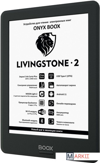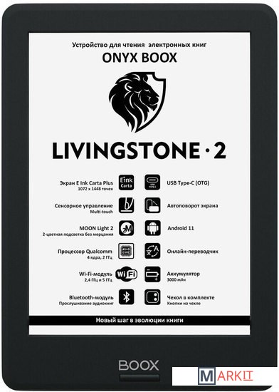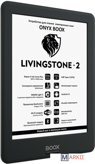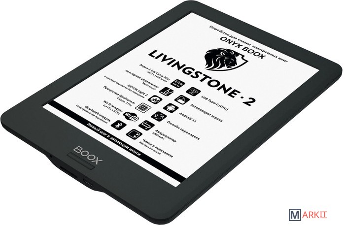 ONYX BOOX Livingstone 2 — шестидюймовый ридер в тонком компактном корпусе, оборудованный экраном E Ink Carta Plus с подсветкой и сенсорным управлением. Модель базируется на современном высокопроизводительном процессоре и имеет 2 ГБ оперативной и 16 ГБ встроенной памяти. Наличие модуля Wi-Fi позволяет пользоваться сетевыми сервисами, а поддержка Bluetooth — подключать беспроводные устройства, включая наушники и колонки. Благодаря использованию операционной системы Android 11 на ридер можно устанавливать различные сторонние приложения. Входящий в состав ПО ридера аудиоплеер дает возможность прослушивать музыку и аудиокниги, а поддержка функции TTS (Текст-в-речь) - озвучивать текстовые файлы. Ридер комплектуется защитной обложкой с удобными кнопками листания на боковой стороне.