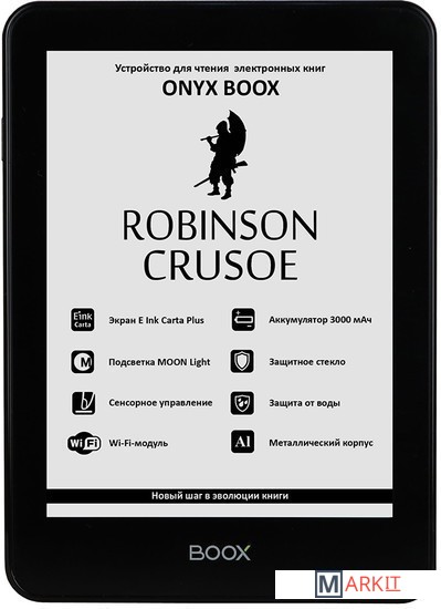 ONYX BOOX Robinson Crusoe — устройство для чтения электронных книг премиального уровня, оборудованное экраном последнего поколения E Ink Carta Plus с подсветкой MOON Light и имеющее защиту от брызг и влаги. Модель выполнена из высококачественных материалов, имеет тонкий корпус из алюминиевого сплава и защитное стекло ASAHI.