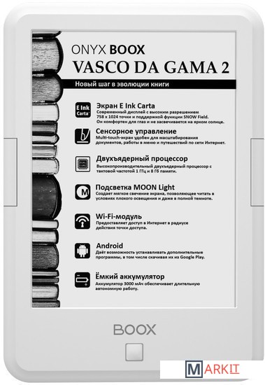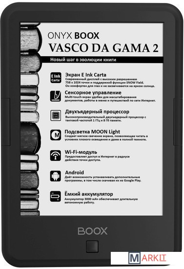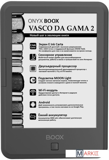ONYX BOOX Vasco da Gama 2 — это устройство для чтения электронных книг с экраном типа «электронная бумага» E Ink Carta, встроенной системой подсветки MOON Light и функцией SNOW Field. Ридер имеет технические характеристики: высокопроизводительный 2-ядерный процессор, 512 МБ оперативной и 8 ГБ встроенной памяти.