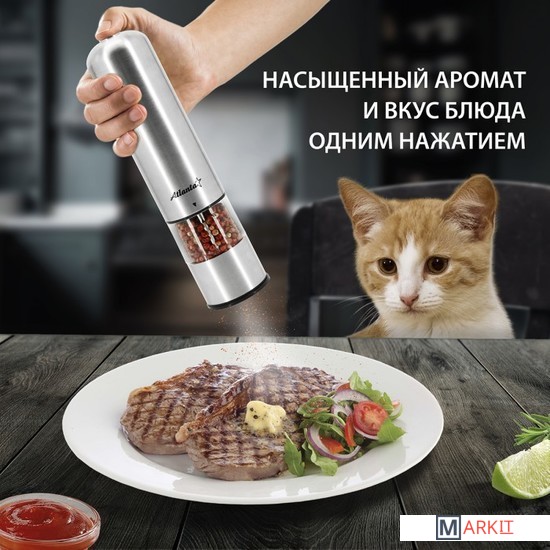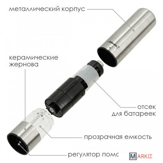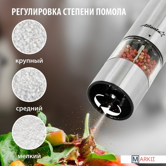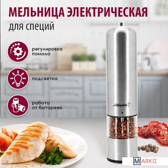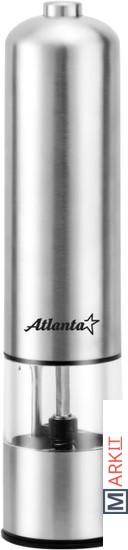 Мельница электрическая для специй Atlanta, работа от 4хАА батареек. Долговечный керамический механизм, корпус из высококачественной нержавеющей стали. Регулировка степени помола. Стильный минималистичный дизайн.