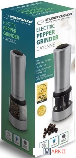 Тип: электроперечница. 2 отсека: для соли и для перца. Регулировка степени помола. Питание: 6xAAA (не входят в комплект).