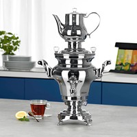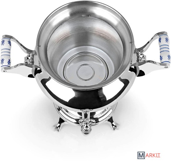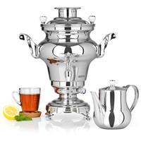 Высококачественные самовары из нержавеющей стали для приготовления чаяРезервуар для воды на 5 л и чайник на 1,3 лНагревательный элемент с 2 нагревательными спиралями (1300 Вт и 500 Вт)Нагревательный змеевик мощностью 1300 Вт автоматически отключается при достижении точки кипенияПодходит для коммерческого использования и частной непрерывной эксплуатации