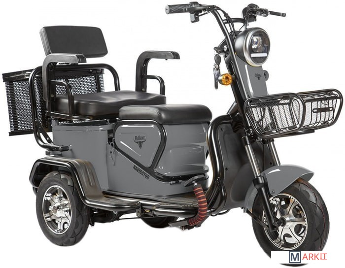 Обратите внимание! Трицикл по умолчанию поставляется без аккумуляторных батарей! Универсальный контроллер 48V/60V;Трансформирующаяся конструкция (заднее сиденье опрокидывается, образуя удобную мягкую спинку с подголовником);Большая металлическая корзина сзади;Крепкая корзина на руле;Светодиодная оптика и поворотники;Переключатель динамики старта (резкий/плавный);Приборная панель с LCD-дисплеем;Сигнализация (два брелока в комплекте).