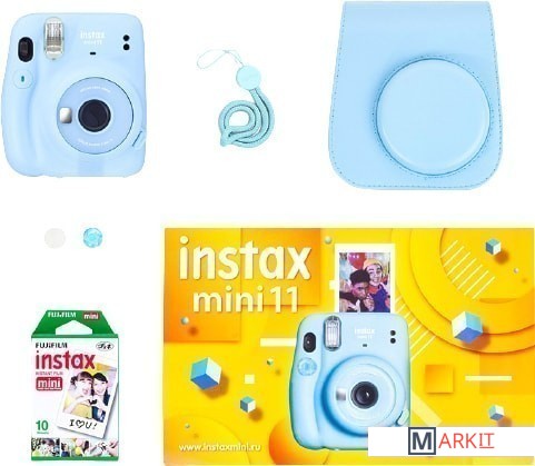 - фотопленка Instax Mini (10 снимков)- две кнопки спуска затвора- шнурок на запястье- жесткий чехол- документация |