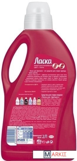 Ласка для Цветного – это средство для стирки одежды ярких цветов. Формула Fibrex-tech с эффектом восстановления цвета ткани была специально разработана для активного ухода за одеждой и поддержания первозданной красоты Ваших вещей стирка за стиркой. Она не только бережно отстирывает загрязнения, но и отлично заботится о Вашей одежде в двух ключевых направлениях:1. Насыщенность цвета:– Защищает яркость цвета, препятствуя переносу красителя во время стирки.– Разглаживает шероховатые волокна для оптимального отражения света 2. Прочность ткани:– Сохраняет прочность ткани.