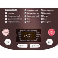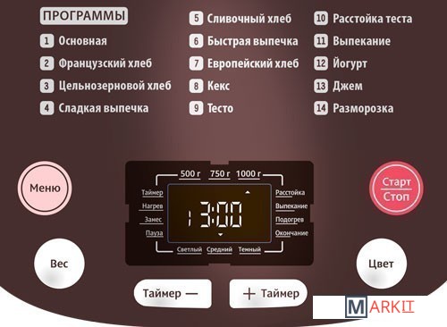 | Перечень режимов работы | вареньезамес тестайогурткекссладкая выпечкафранцузский хлебцельнозерновой хлеб |