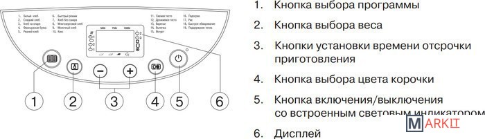 | Перечень режимов работы | французский хлебржаной хлебсладкая выпечкабелый хлебзамес тестакаша |