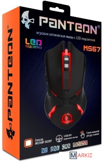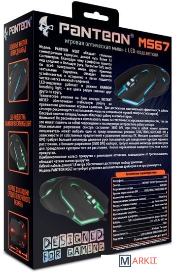 Модель PANTEON MS67 обладает стильным симметричным корпусом, длиной чуть более 13 сантиметров, благодаря чему комфортно ложится под среднюю и большую руку. Покрытие Soft touch по всей поверхности мыши дарит приятные тактильные ощущения, обладает высокой устойчивостью к истиранию и легко поддается чистке слегка влажной салфеткой.LED-подсветкаработает в режиме RAINBOW breathing light - все цвета радуги сменяют друг друга по кругу.Боковые кнопки «вперед/назад» облегчают работу за компьютером.