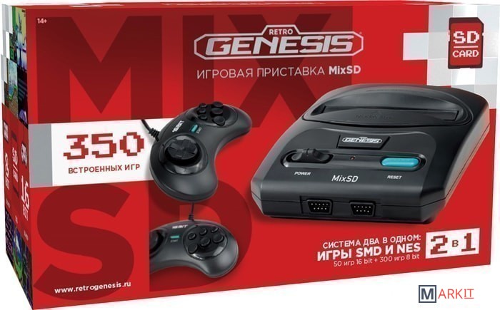 Игровая приставка Retro Genesis MixSD с поддержкой сразу двух платформ – 8 и 16 бит – позволяет играть в игры типа Famicom/NES/Dendy и Sega. А с помощью слота для карт памяти microSD можно запускать собственные 16-битные игры.Встроенные 350 игр, из которых 300 игр 8 бит и 50 игр 16 бит, предлагают широкий спектр развлечений, в числе которых увлекательные игры про Марио, Танчики и Соника. Приставка оснащается классическим AV-разъемом. В комплект с приставкой идут два проводных джойстика в привычной форме геймпадов Sega с шестью кнопками действия.Главной особенностью данной модели приставки является то, что она построена на аналоге оригинального железа, а значит имеет максимальную совместимость с играми, которые запускаются на скорости 60 кадров в секунду, и при этом позволяет запускать собственные игры 16 Bit. Кроме этого, запуск и перезагрузка приставки происходят моментально.Преимущества:- Полноценное воспроизведение игр на 60 кадрах в секунду за счет использования аналога оригинального железа классических приставок – никаких эмуляторов.- Система два в одном: игры SMD и NES.- Разъем microSD, с помощью которого можно запускать собственные игры 16 Bit с карты памяти.- 350 встроенных игр: из них 50 игр SMD и 300 игр NES. Игры не повторяются, не являются клонами самих себя или разными уровнями одной и той же игры.- Слот для картриджей с играми 16 Bit. Позволяет запускать игровые картриджи «Sega».- Увеличенная совместимость за счет двух переключателей регионов: J/O и N/P.- Раздельные каталоги игр на 16 и 8 бит, ранжированные по алфавиту.- Два проводных джойстика в комплекте.!!! Рекомендуется для подключения к классическим ЭЛТ-телевизорам с разрешением SD.