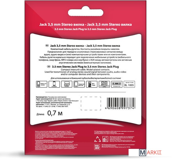 | Разъемы | 3.5 мм jack (M-M) |