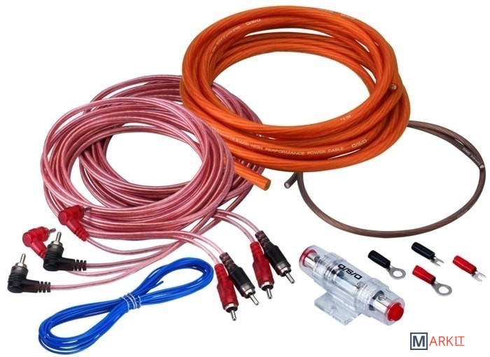4,5м 8AWG оранжевый матовый силовой кабель, 0,7м 8AWG черный матовый силовой кабель, miniANL держатель с предохранителем на 50А, 5м 4-канальный RCA кабель витая пара, 5м 18AWG голубой управляющий провод, ), 8 мм клеммы вилка (красн+черн), клеммы позолоченные кольцевые 8мм (2шт), изолятор красный/черный. Упаковка Zip Lock