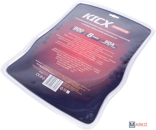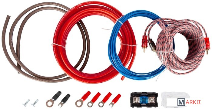 Установочный комплект для 2-х канального усилителя:- 8AWG силовой медно-алюминиевый кабель в красной эластичной изоляции — 5 метров;- 8AWG силовой медно-алюминиевый кабель в коричневой эластичной изоляции — 1 метр;- 20AWG медно-алюминиевый кабель управления в изоляции синего цвета – 5 метров;- Держатель для предохранителя MiniANL + предохранитель 60A+ 2 винта;- 2RCA-2RCA кабель витая пара - 5 метров;- Клемма кольцевая для силового кабеля сечением 8AWG - 4 штуки;- Клемма U-образная для силового кабеля сечением 8AWG - 2 штуки.