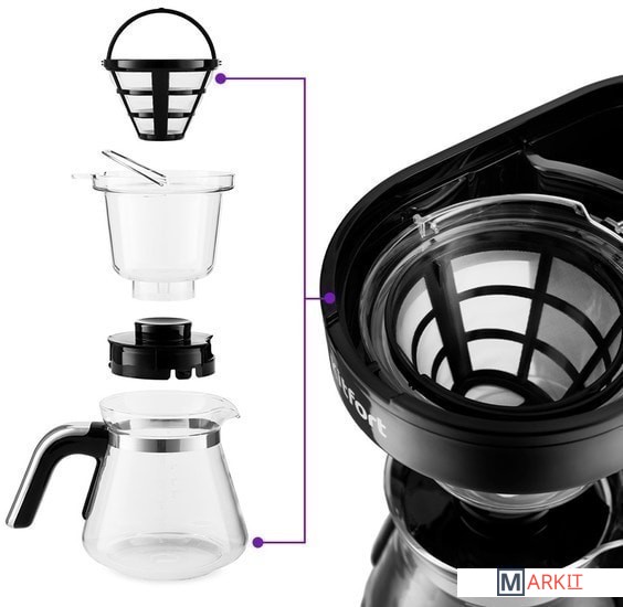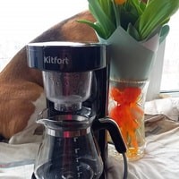 В капельной кофеварке Kitfort КТ-759 вода доводится до t 80-90 °С, далее медленно поступает в фильтр с молотым кофе. Пройдя через него, она попадает в кофейник. Конструкция «2 в 1» позволяет снять воронку с фильтром и приготовить кофе методом «Пуровер».Функция подогрева кофейника в течение 40 минут.Длина шнура: 0.7 м.
