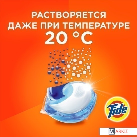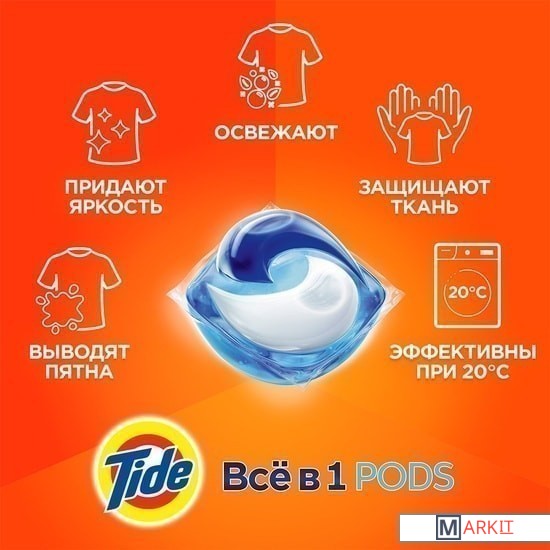 Капсулы для стирки TIDE Всё в 1 Color — это потрясающая эффективность всего в одной капсуле. Кристальная чистота и никаких следов. Попробуйте инновационное средство для стирки от Tide — Tide ВСЁ в 1 PODS. Каждая капсула состоит из 3 секций — таким образом, ее ингредиенты не смешиваются до начала стирки. При контакте с водой специальная инновационная пленка растворяется, и капсула начинает свое действие: очищает, удаляет пятна, придает яркость и освежает; она эффективна уже при 20 °С. Одной капсулы хватает, чтобы полностью выстирать полный барабан грязных вещей. Tide ВСЁ в 1 PODS — это надежный выбор для удивительно эффективной стирки. Используйте вместе с кондиционерами Lenor, которые придают белью еще больше мягкости и свежести. ВНИМАНИЕ. Продукт может быть опасен. Берегите капсулы Tide от детей.