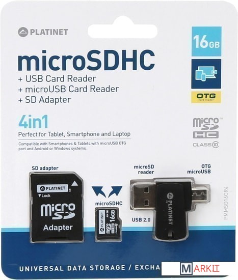 Markit » Карты памяти » Карта памяти Platinet PMMSD16CR4 16GB + адаптер, кардридер