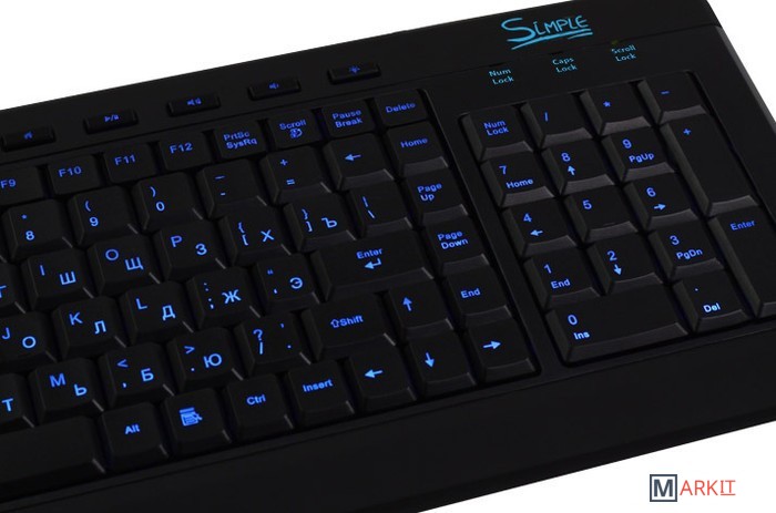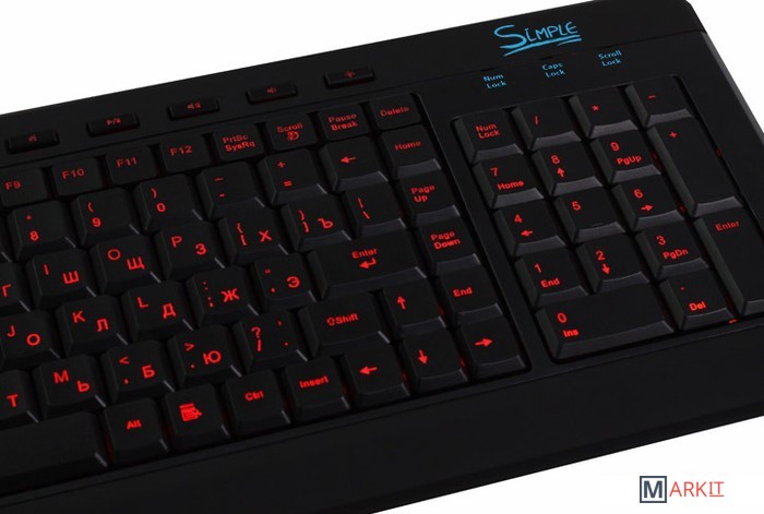 Простая мультимедийная клавиатура с подсветкой символов. Включить/отключить, а также сменить цвет подсветки можно при помощи специальной кнопки, совмещенной с клавишей Scroll.