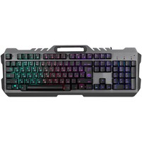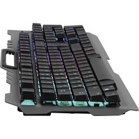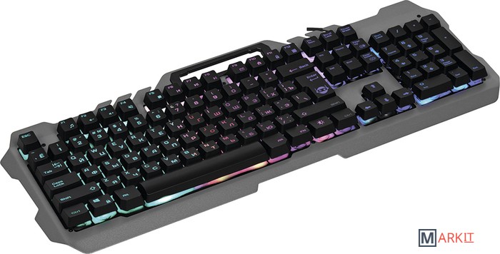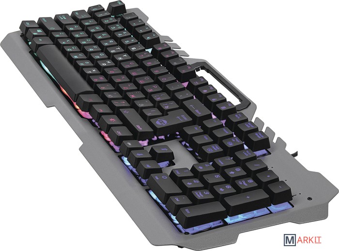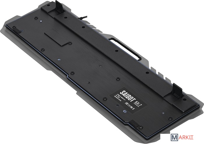 Игровая проводная клавиатура KX-7 имеет металлическую верхнуюю панель, снабженную держателем для мобильного телефона. Прорезиненные ножки предотвращают скольжение клавиатуры по столу. Лазерная гравировка символов позволяет английским и русским символам быть хорошо различимыми в полной темноте. Радужная LED подсветка работает в двух режимах - статичная подсветка и дышащая подсветка.