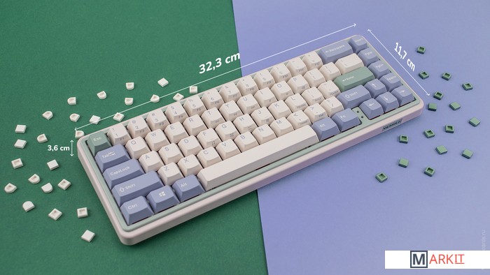 Varmilo — яркая звезда на небосводе китайских производителей клавиатур. Смазанные стабилизаторы, ручная сборка, эстетичный дизайн — каждая клавиатура Varmilo как произведение искусства. Дизайн Minilo вдохновлен работами итальянского художника Джорджио Моранди: сочетает в себе оттенки бежевого, серо-голубого и зеленого.Беспроводная клавиатураПоддержка Bluetooth 5.0 соединения позволит вам скинуть с себя оковы проводного рабства.Встроенный аккумуляторВстроенный аккумулятор на 3000 мАч позволяет клавиатуре работать в беспроводном режиме более 20 дней.Doubleshot ABS кейкапыПриятные и гладкие на ощупь, а символы никогда не сотрутся — ведь они отлиты из пластика.Шумо- и виброизоляцияВнутри две подложки: в корпусе + между платой и плейтом. Они поглощают звуки и вибрации при нажатии и делают процесс печати тише.Если тишина имеет большое значение, рекомендуем заменить заводскую шумоизоляцию на нашу из бипласта.Мягкий на ощупь корпусСделан из пластика, напоминающий покрытие «soft-touch» — шелковистый и приятный.Стабилизаторы, смазанные на заводеСочетание стабилизаторов и смазки делает ход клавиш enter, space, shift, backspace равномерным и плавным.Белая подсветкаИмеет 3 режима: выключена, статичное свечение, эффект затухания, и 4 уровня яркости.Режимы меняются через FN + [ и ], FN + стрелка вверх/вниз меняет яркость в режиме статичного свечения и скорость в режиме затухания.Вместо заводской белой подсветки можно установить кастомную подсветку другого цвета.Сменные клавишиВ комплекте есть дополнительные кейкапы для пробела, Esc, “~” и Enter.Регулируемые ножкиПозволят приподнять клавиатуру и изменить угол наклона для комфортной печати, а прорезиненный низ не даст клавиатуре сдвинуться с места. Мультимедиа и дополнительные FN функцииКлавиатура поддерживает сочетания клавиш для регулировки громкости и управления музыкой. Также можно отключить кнопку windows и поменять клавиши Fn и Win/Ctrl и Caps Lock местами.Функция Full N-key Rollover по USB (NKRO)Позволяет нажимать одновременно неограниченное количество клавиш. Удобно в игре, когда нужно прожимать многокнопочные комбинации.Осторожно, старые BIOS-ы могут не реагировать на клавиатуру из-за NKRO.Если ALT и WIN поменялись местами или сбились назначения клавиш:Зажмите Fn + D + Backspace, пока не заморгает CapsLock (Сбросить настройки клавиш)Fn + D (Сброс до заводских настроек)