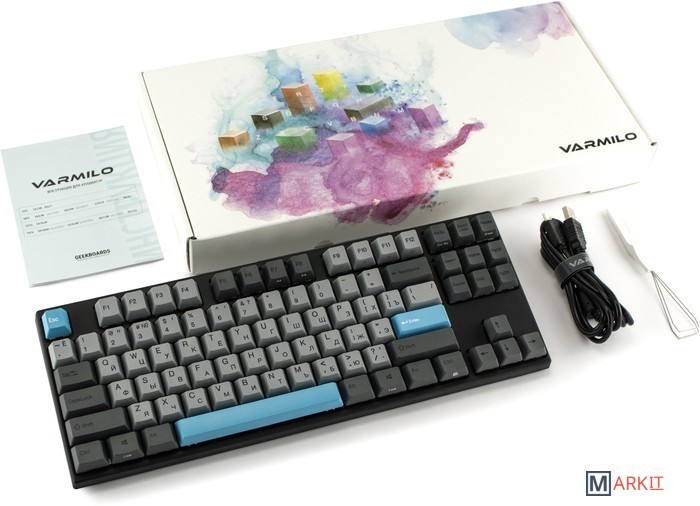 Комплект поставки Клавиатура;Коробка;Крышка для защиты от пыли;Varmilo wire keycap puller – позволит легко снять клавиши с клавиатуры;USB Type-C кабель с велкро застежкой;Инструкция;Дополнительные серые клавиши-модификаторы: 2x Shift; 2x Alt; 2x Ctrl; 2x Windows; Fn.