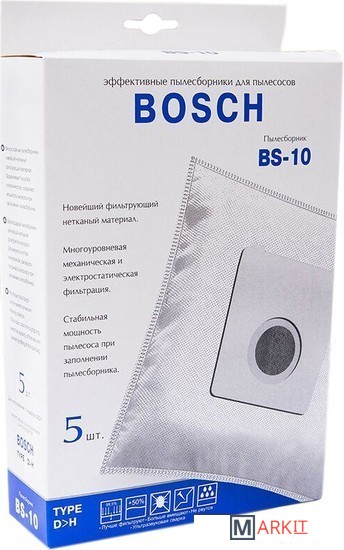 Мешки BS-10 предназначены для уборки пыли классов «L».Пылесборники не боятся воды и острых предметов, прочность на разрыв — до 32 кг, вместимость около 3,5 литра.