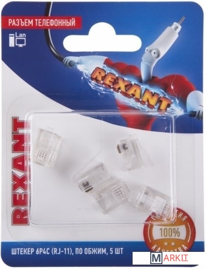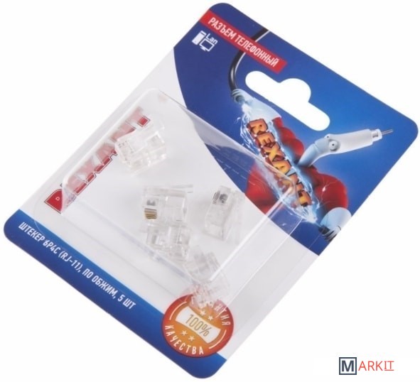 Разъём штекер 6P4C (RJ-11) размещают на концах телефонного кабеля ШТЛП для соединения телефонного аппарата с телефонной розеткой.Разъем изготовлен из прозрачного поликарбоната, содержит 6 посадочных мест и 4 ножа-контакта, контакты выполнены из медных сплавов, покрыты тонким слоем технического золота, что улучшает физические характеристик.Номинальное напряжение 48 В постоянного тока (макс = 57 В) с максимальным током до 600 мА.Для опрессовки разъема необходим специальный обжимной инструмент.